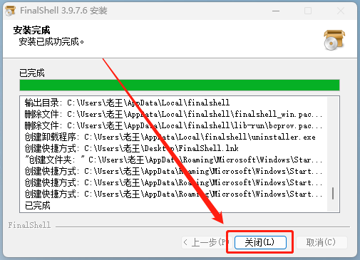 耐心等待 FinalShell 安装完成,然后点击“关闭”按钮结束安装