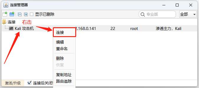 创建好之后连接就会出现在连接管理器中,选中需要启动的连接,右击,点击“连接”