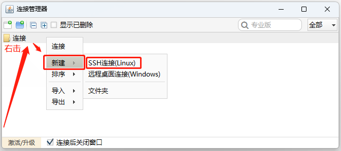 右击刚才新建的“连接”文件夹,选择“新建”→“SSH 连接”
