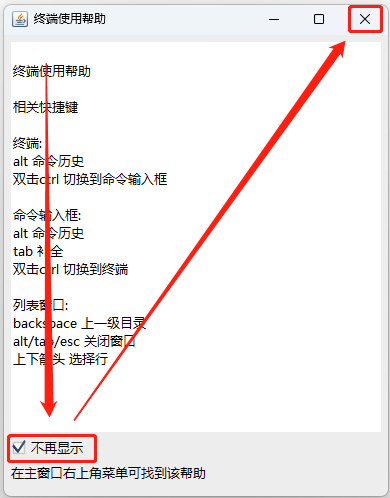 终端使用帮助可以学习一下,完事之后勾选“不再显示”,然后关闭弹窗