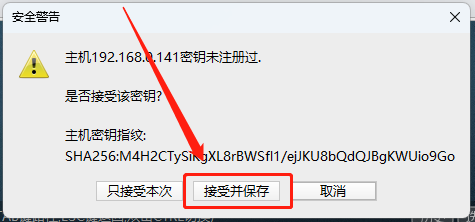 首次连接一台 Linux 的时候可能会弹出接受密钥的弹窗,这里点击“接受并保存”即可