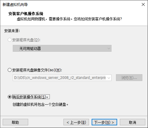 4、在安装客户机操作系统页点击稍后安装操作系统,然后单击“下一步”按钮。(注: 在这里我喜欢用稍后安装操作系统,因为在这里选择镜像之后有很多人喜欢点简易安装,为了后续不出问题,所以点稍后安装)