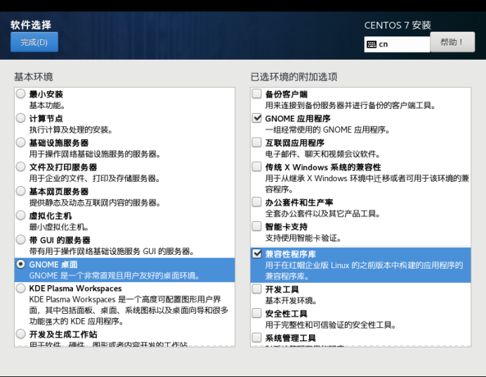 20、最小安装是命令行界面,我们选择GNOME桌面,然后在右侧选中GNOME应用程序和兼容程序库。点击完成。