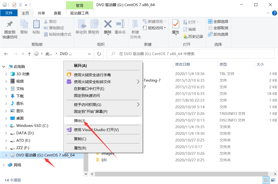 在下载完iso镜像后,千万别打开iso后缀的镜像文件,有些小白同学不知道怎么搭建虚拟机,直接双击打开了 iso的镜像文件,然后运行了里面的setup.exe 这样会导致 自己的系统重装,这一步非常危险千万不要直接双击打开镜像文件。如果你不小心,打开了镜像文件,看下图, 选中打开的iso磁盘,然后右键 弹出即可。请看下图