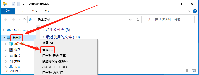 6. 右击左侧的“此电脑”,然后点击选项中的“管理”