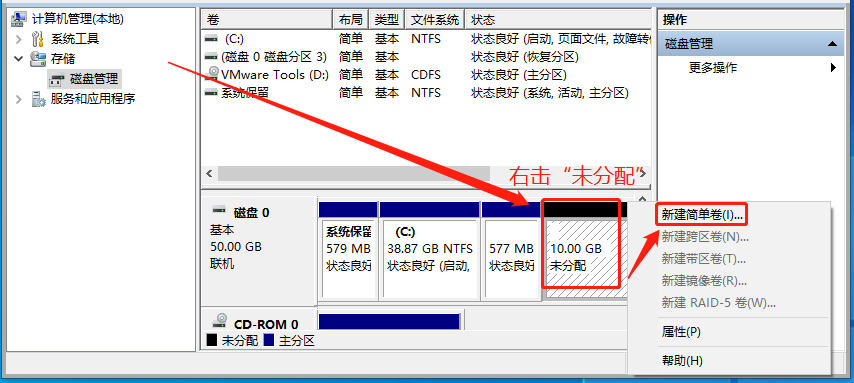 8. 右击磁盘中“未分配”的区域,点击“新建简单卷”