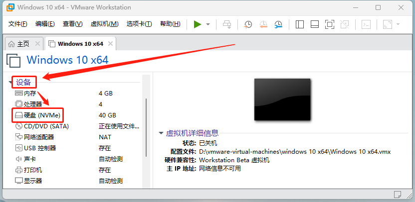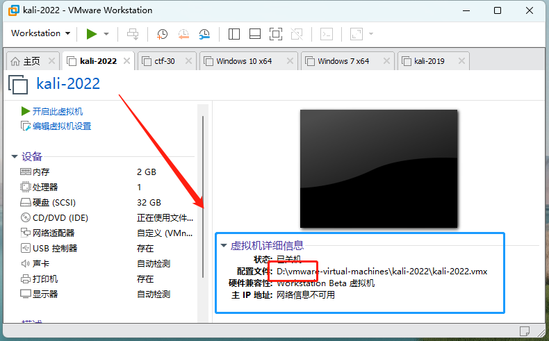 虚拟机关机状态下,可以在虚拟机页面下方的“虚拟机详细信息”里,看到虚拟机所在的文件夹,这里我们只需要记住盘符就好了,例如这张图里是 D 盘
