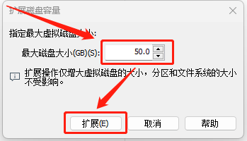 3. 将硬盘容量扩展到想要的大小,然后点击下面的“扩展”按钮