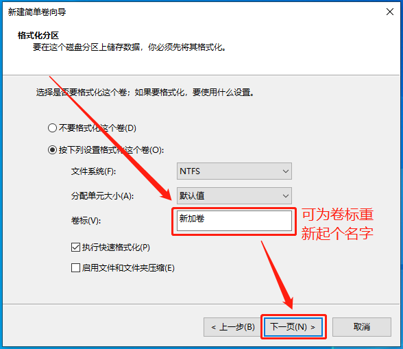 12. 默认格式化选项,卷标可改可不改,然后“下一页”