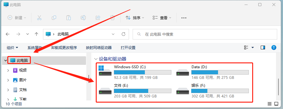 3. 点击文件管理器左侧的“此电脑”,右侧就会显示当前各盘的容量摘要了